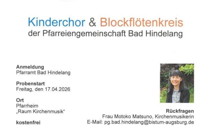 Ab Freitag, 17.04.2026 bietet die Pfarreiengemeinschaft Bad Hindelang unter der Leitung von Kirchenmusikerin Motoko Matsuno jeweils Freitags einen Kinderchor und... Weiterlesen