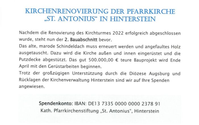Für den 2. Bauabschnitt der Sanierung des maroden Schindeldaches der Pfarrkirche St. Antonius in Hinterstein bittet die Kirchenverwaltung Hinterstein um... Weiterlesen