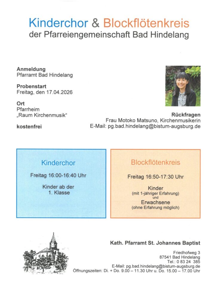 Ab Freitag, 17.04.2026 bietet die Pfarreiengemeinschaft Bad Hindelang unter der Leitung von Kirchenmusikerin Motoko Matsuno jeweils Freitags einen Kinderchor und einen Blockflötenkreis an.