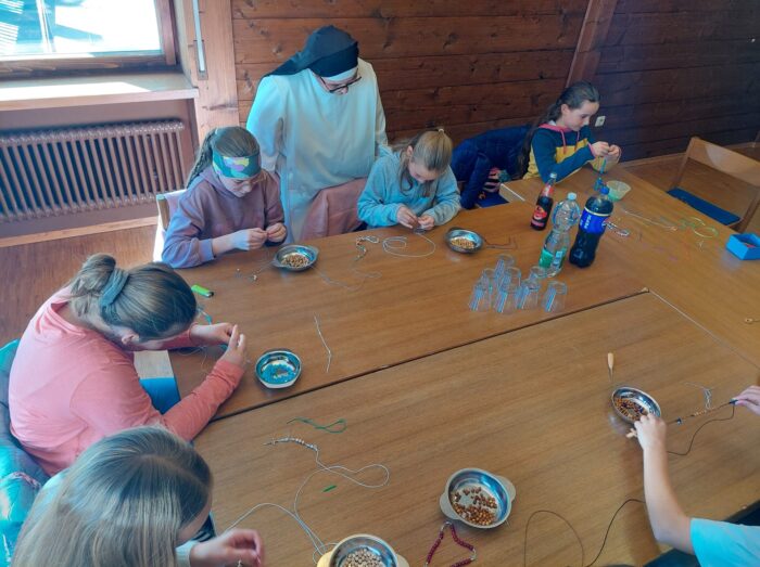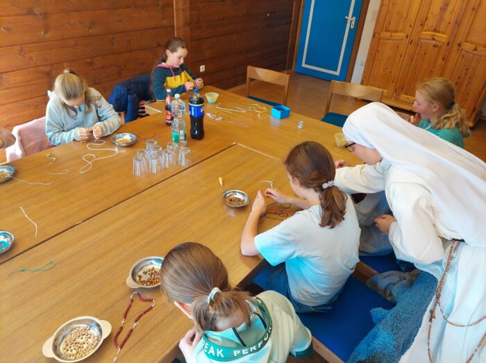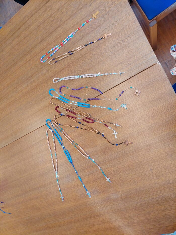 Jeder Firmling durfte nach Anleitung durch die beiden Schwestern seinen eigenen Rosenkranz knüpfen. Viel Freude und Spaß machte dies den Firmlingen und es enstanden dabei viele tolle bunte Rosenkränze.