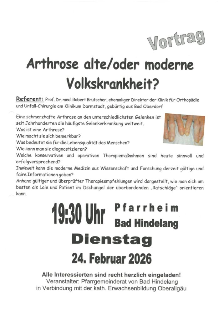 Vortrag: „Arthrose alte/oder moderne Volkskrankheit?“ am Dienstag, 24.02.2026 um 19.30 Uhr im Pfarrheim Bad Hindelang
